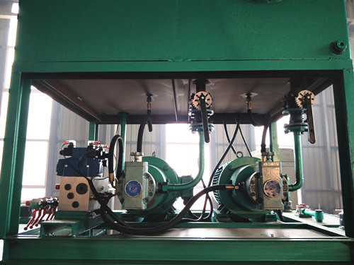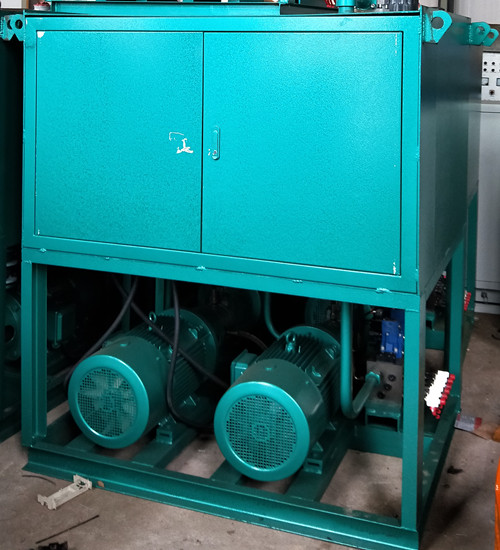 该泵站的正面面板上布置有;电控箱、两只电流表、电压表、压力表、调压阀、两个油泵排量调节手轮。在泵站的左侧下方,共有12个油口。带6个球阀的油口与主顶油缸后腔连接,联结螺纹为M22×1.5。另外一排油口与主顶油缸前腔连接,联结螺纹为M22×1.5。在泵站的顶部有加油口。在泵站的左侧有液位计,平时应注意液位变化,适时加油。电控箱用于分别控制两台电机的开停、主顶油缸的伸出、停、与 回缩、显示电压与电流。压力表用来反应液压系统的压力。调压阀调节系统压力,此压力可根据情况调节,最高为31.5Mpa。油泵调节手轮用来改变油泵排量大小,可从手轮下部的圆形刻度盘上显示。